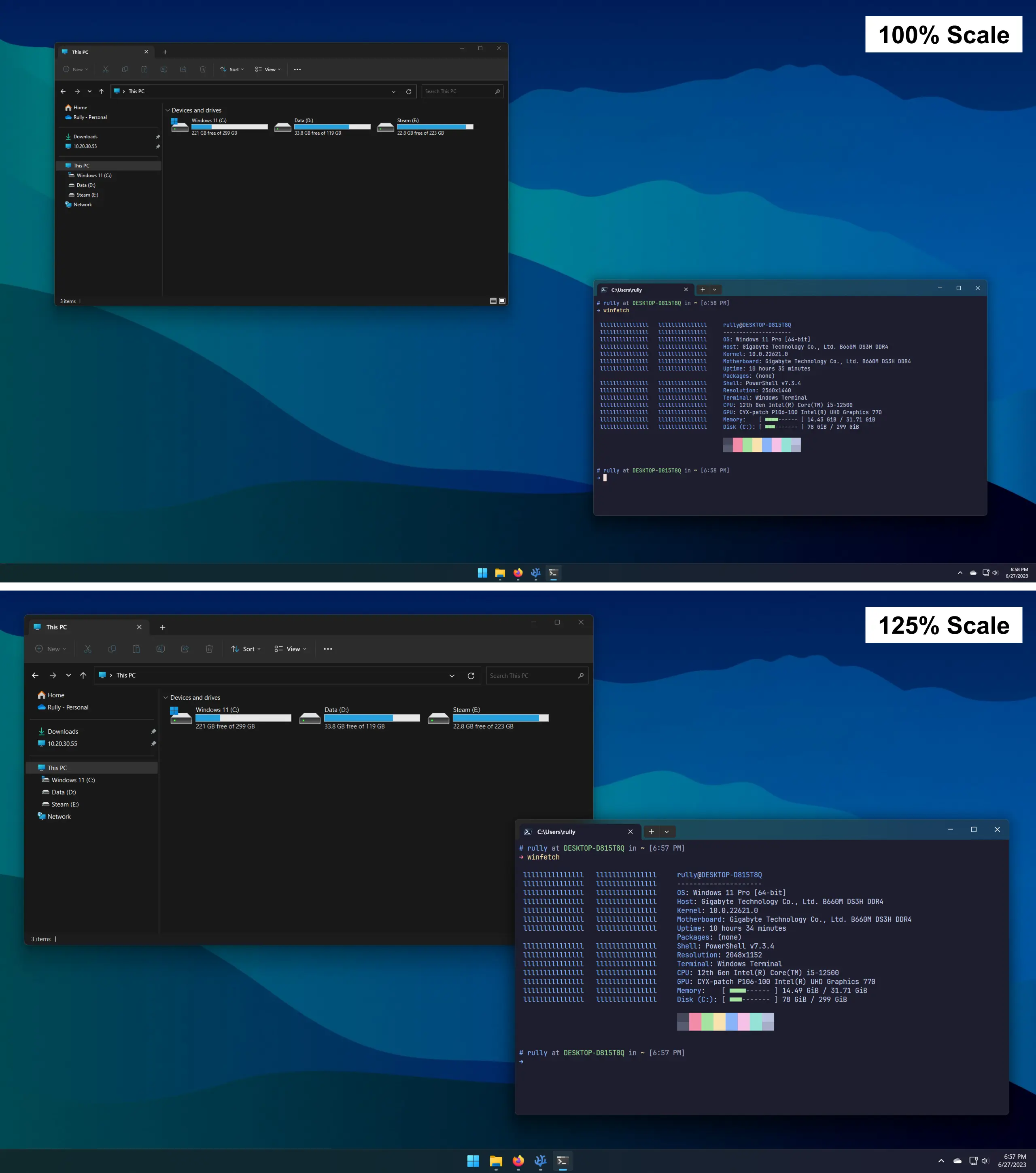 Kembali lagi ke monitor 1440p 24-inch saya yang memiliki PPI sebesar 122.4, Windows merasa tampilan yang tampil di layar akan sangat kecil apabila menggunakan scaling 100%, maka secara otomatis mengubahnya menjadi 125% atau PPI sebesar 91.8 yang mana lebih nyaman di mata. Berikut ini perbandingan scaling 100% vs. 125%.
