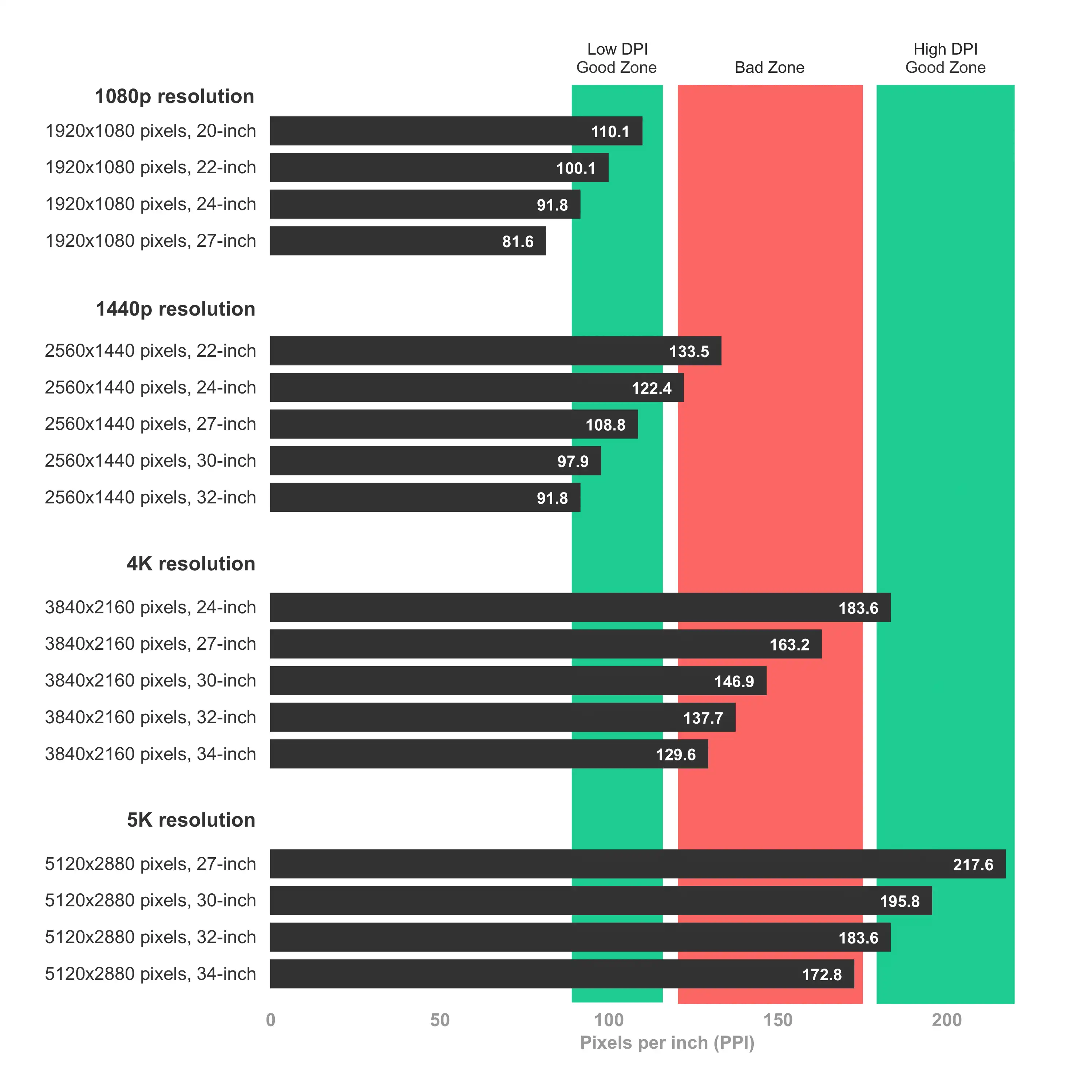 Berdasarkan pengamatan saya, pixels per inch (PPI) yang ideal untuk Windows adalah sebesar 96 untuk low-DPI dan 192 untuk high-DPI, sedangkan untuk macOS adalah sebesar 110 untuk non retina dan 220 untuk retina. Tidak perlu selalu tepat di angka tersebut, monitor dengan PPI yang mendekati nilai-nilai di atas masih nyaman digunakan. Namun ingat, semakin kecil nilai PPI, semakin besar tampilan yang muncul di layar, dan sebaliknya, semakin besar PPI maka semakin kecil tampilan yang muncul di layar.
